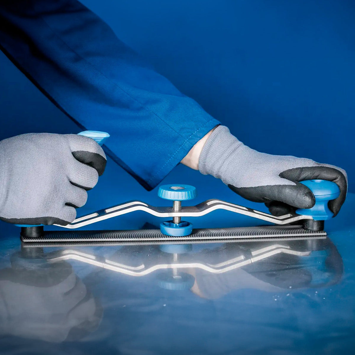 O suporte ergonômico e especialmente leve permite o tensionamento individual de lâminas de limas de funileiro para corresponder ao contorno da superfície da peça de trabalho.